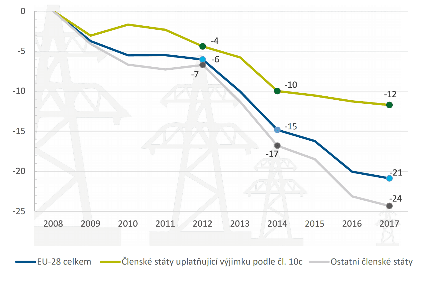Změny uhlíkové náročnosti v odvětví energetiky oproti roku 2008 (v %). Srovnávána je míra dekarbonizace osmi členských států, které využívaly výjimku čl. 10c Směrnice o EU ETS a EU jako celku. U první uvedené skupiny postupovala míra dekarbonizace pomaleji. Zdroj: Zvláštní zpráva EÚD