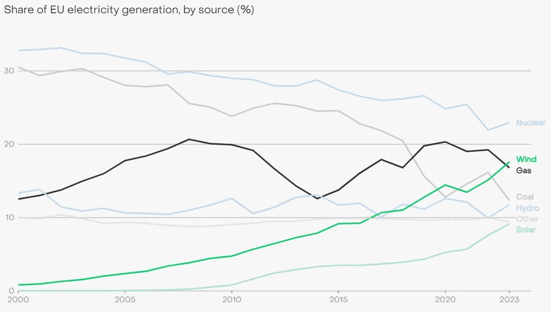Nízkoemisní zdroje zastávaly v roce 2023 víc než dvoutřetinovou převahu nad fosilními zdroji zejména kvůli opětovnému nárůstu produkce z vodní energie a jaderných zdrojů. Samozřejmě napomohly také větrné a solární elektrárny, které zaznamenaly 27% podíl na evropském elektroenergetickém mixu.