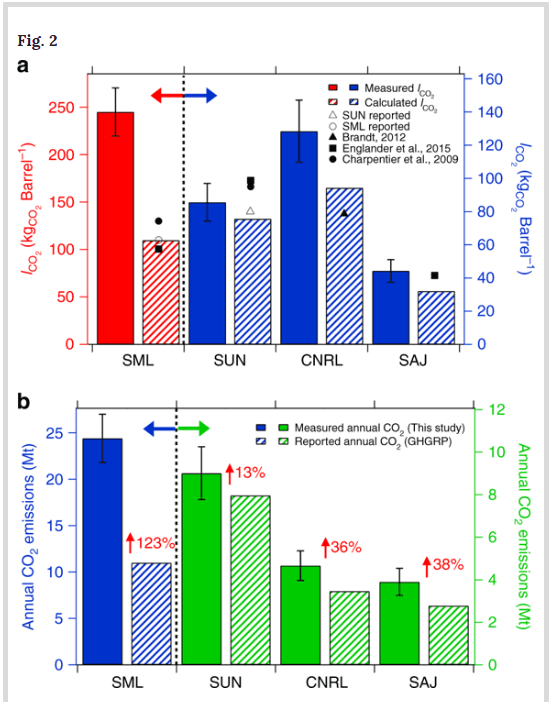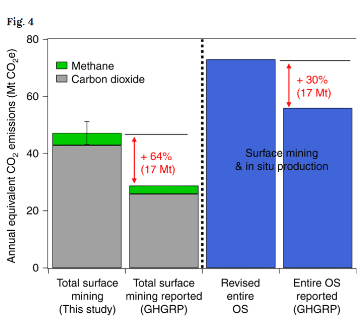 Na výše uvedeném obrázku můžeme vidět rozdíly v hodnotách, které byly naměřeny vědci a které byly uvedeny odvětvím pro čtyři největší těžební oblasti. Největší rozdíl byl 123 % pro těžební oblast Syncrude Mildred Lake a nejmenší rozdíl byl zaznamenán pro těžební oblast Suncore.