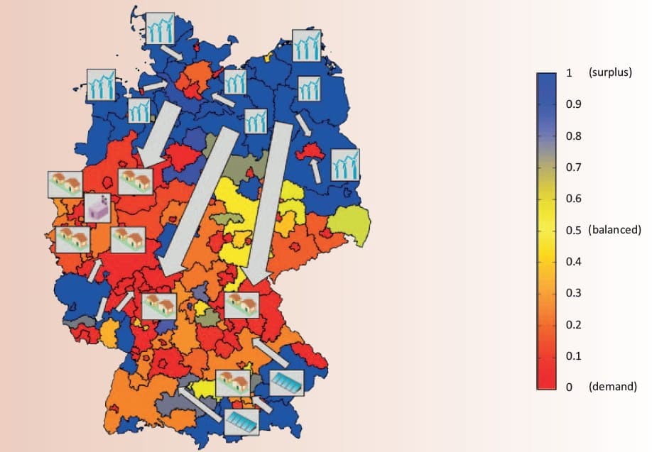 Problém, kterému současná německá elektrizační soustava čelí, je geograficky nevyrovnané rozložení výroby a spotřeby elektřiny. Zatímco většina výroby elektrické energie z obnovitelných zdrojů pochází z větrných elektrárnách na severu Německa, těžiště německé spotřeby elektřiny je v jeho jižní části. Zdroj: IEA – Technology Roadmap: Energy Storage