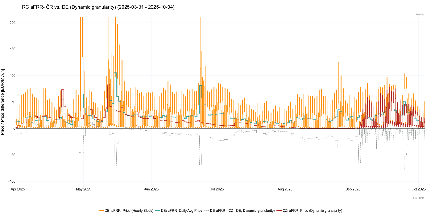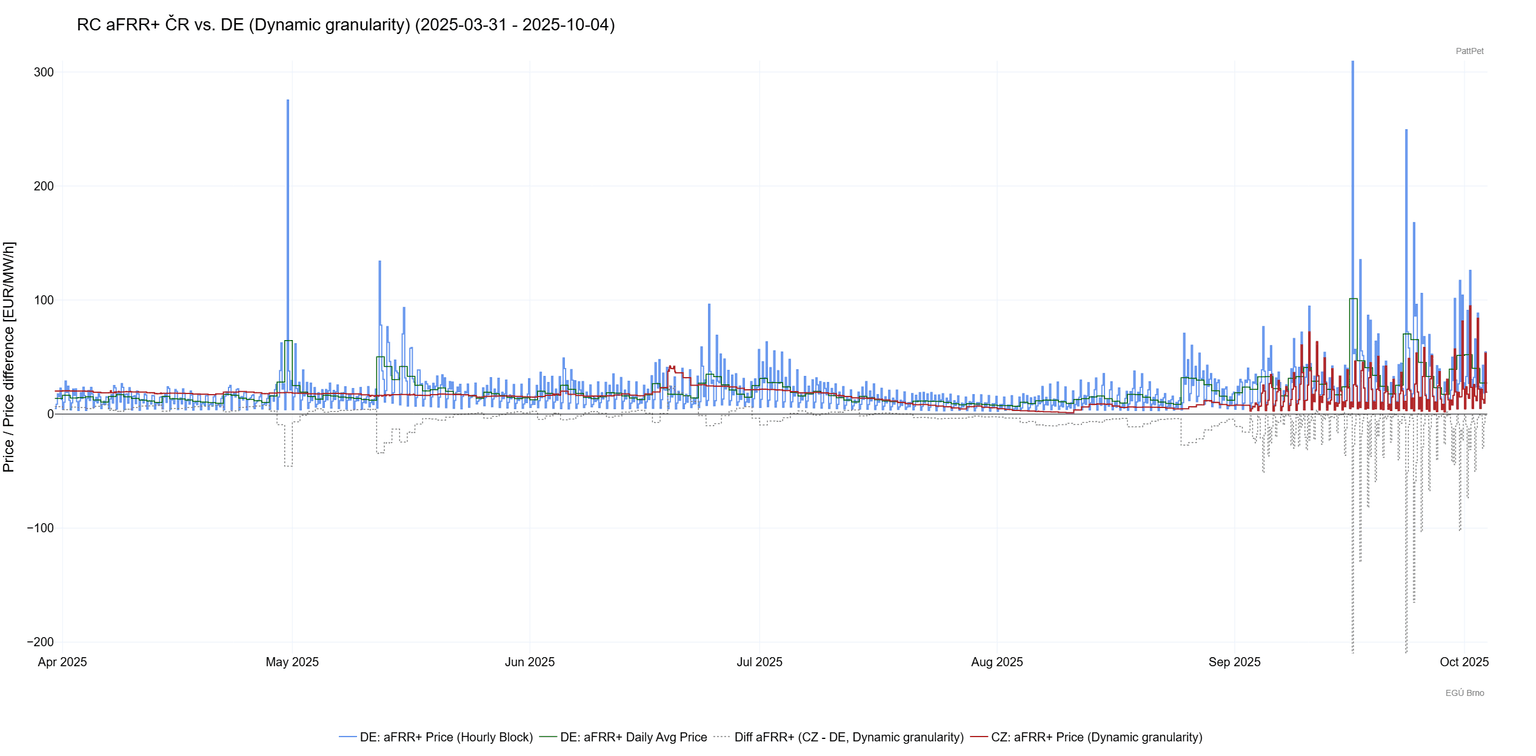 V roce 2025 je v Česku průměrná cena u aFRR+ přibližně 20 €/MW/h a v záporném směru 16€/MW/h. V Německu činí přibližně 15 a 16 €/MW/h. Rozdíl v kladném směru se tak zúžil na zhruba 5 €/MW/h a v záporném směru prakticky zmizel.