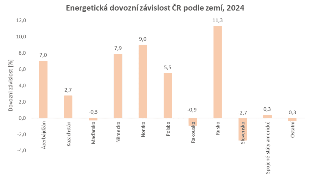 Při pohledu na energetickou dovozní závislost České republiky podle zemí je patrné, že i přes významný pokles v důsledku diverzifikace zdrojů spojené s válkou na Ukrajině je Česká republika nejvíce závislá na Rusku, a to s hodnotou 11,3 %. Následuje Norsko s 9,0 % a Německo se 7,9 %. Zemí s nejvyšší energetickou dovozní závislostí na ČR je potom Slovensko s 2,7 %.