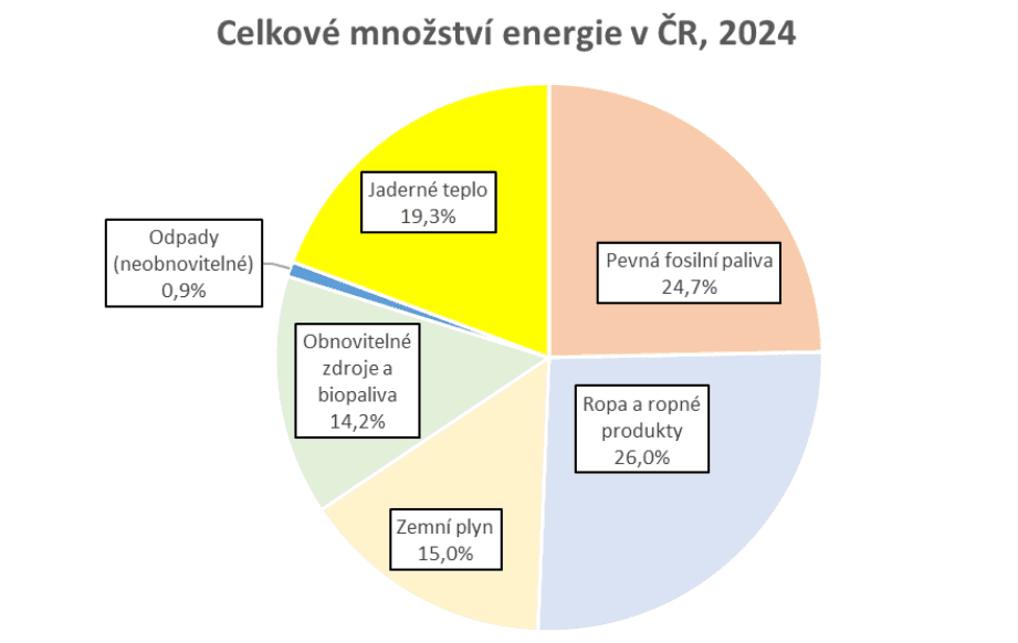 Přestože ve sledovaném období 2014 až 2024 klesla spotřeba celkového množství energie v České republice z 1 759 PJ na 1 583 PJ, tak celková dovozní energetická závislost vzrostla, a to zejména v důsledku útlumu primární produkce energie (využití tuzemských zdrojů) z 1 235 PJ na 901 PJ.