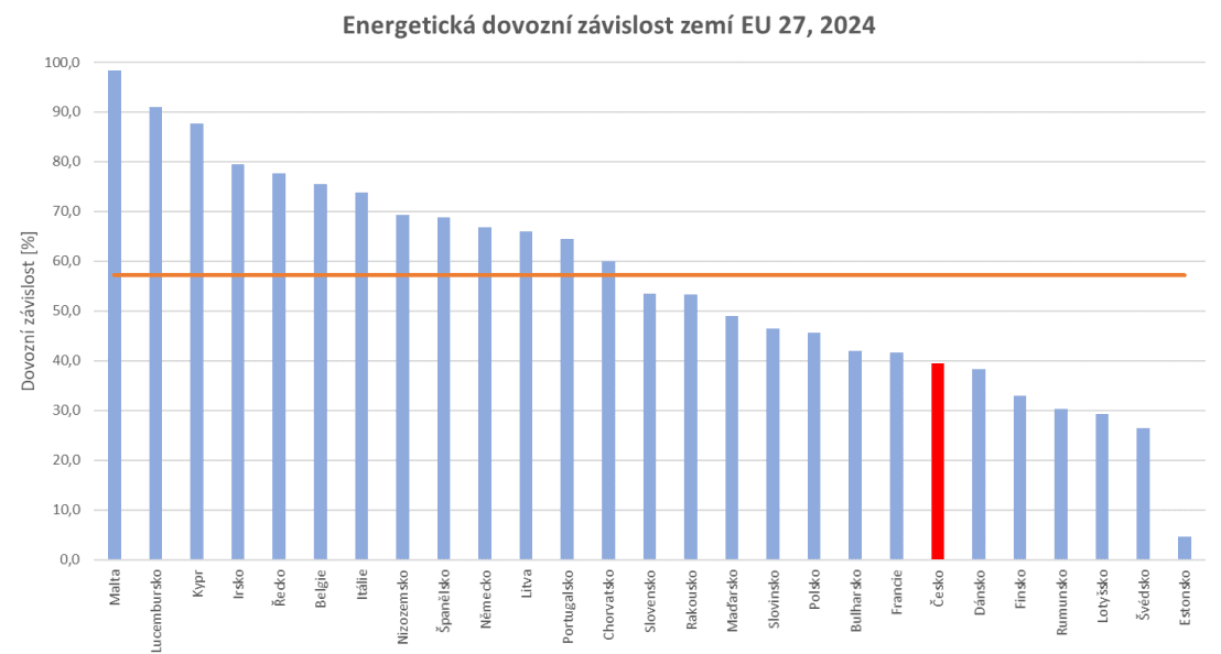 Ačkoliv celková energetická dovozní závislosti České republiky vzrostla během 10 let téměř o třetinu a v roce 2024 činila téměř 40 %, patřila Česká republika mezi země Evropské unie s nízkou energetickou závislostí. Nižší energetickou dovozní závislost v roce 2024 vykazovalo pouze Dánsko, Finsko, Rumunsko, Lotyšsko, Švédsko a Estonsko. Naopak mezi země s nejvyšší energetickou dovozní závislostí patřila Malta, Lucembursko, Kypr, Irsko, Řecko a Belgie.
