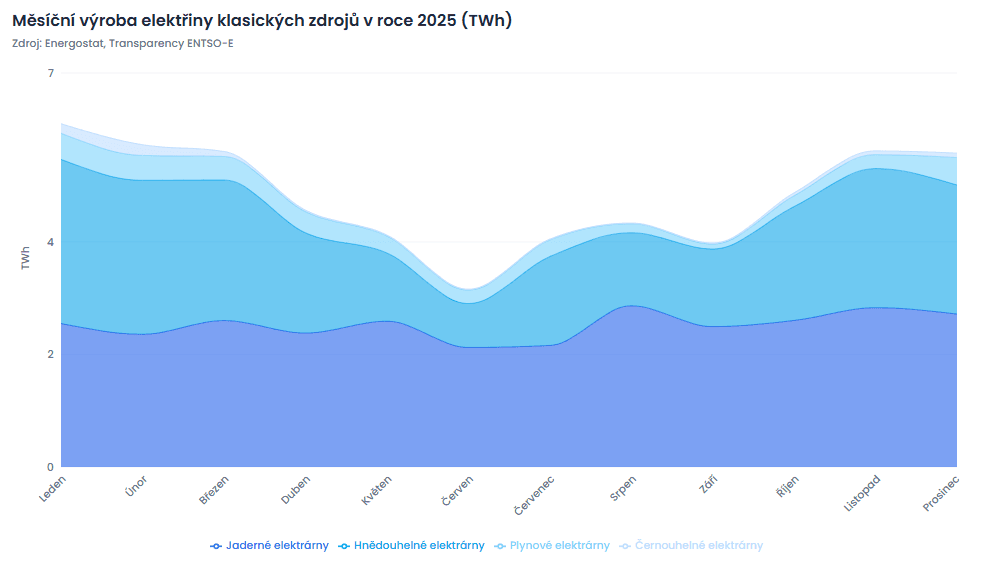 Jak je patrné z dat uvedených ve zprávě Elektroenergetika v ČR v roce 2025, výroba elektřiny z hnědouhelných elektráren dosahovala loni v zimních měsících zhruba 2,3 až 2,9 TWh/měsíc, zatímco v letních měsících klesala i pod 1 TWh/měsíc. Výrazná sezónnost byla v loňském roce vidět také u elektráren spalujících zemní plyn, u kterých byla výroba elektřiny v zimních měsících násobně vyšší než výroba v letních měsících.