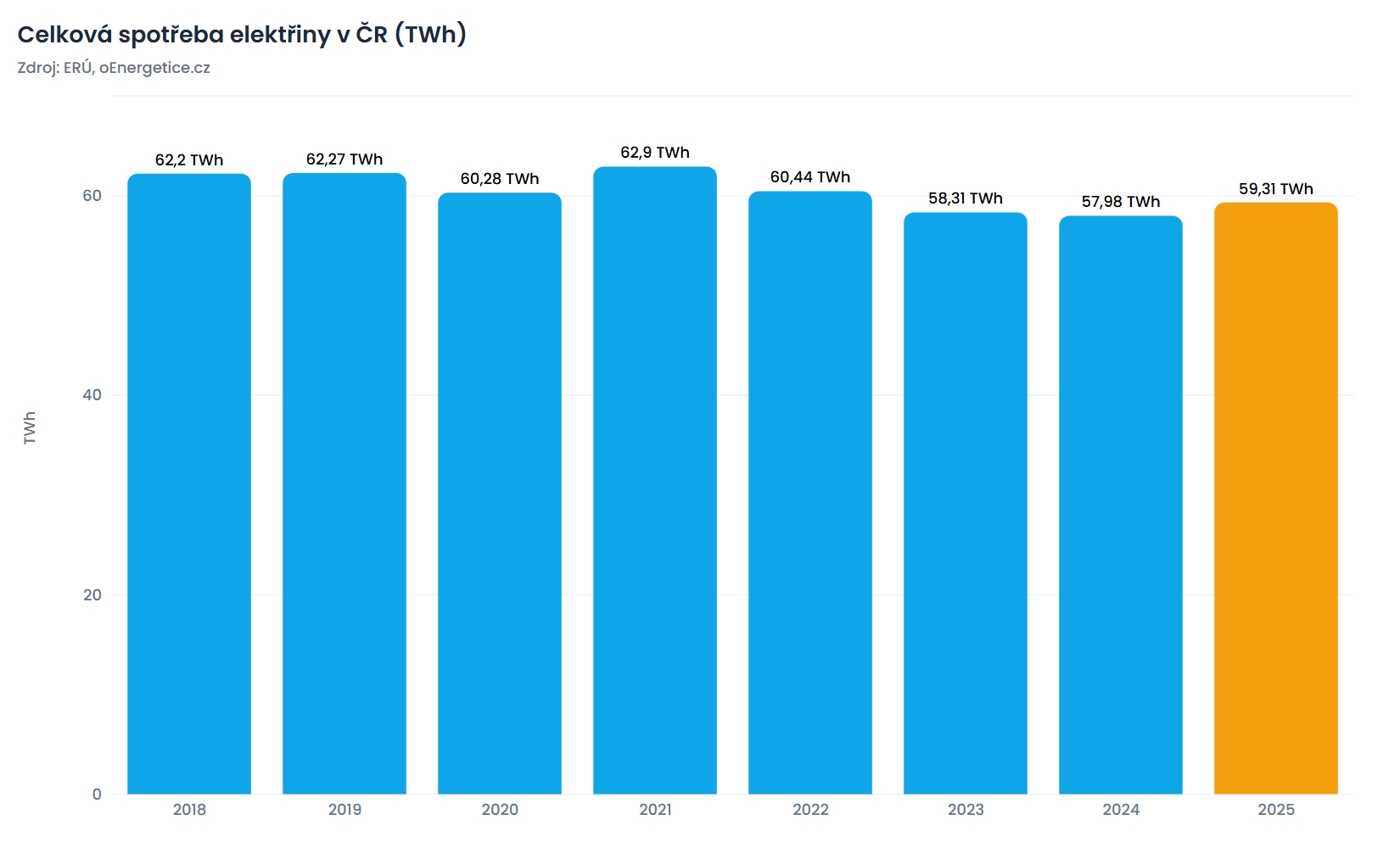 Zatímco v roce 2024 se pokles spotřeby elektřiny trvající od roku 2021 zastavil, v roce 2025 nastal mírný nárůst, když spotřeba meziročně vzrostla o cca 2,3 %. Čistá spotřeba dosáhla 59,3 TWh. To je stále méně než spotřeba před rokem 2023. V letech 2018, 2019 a 2021 byla ve srovnání s loňským rokem spotřeba o cca 5 % vyšší.