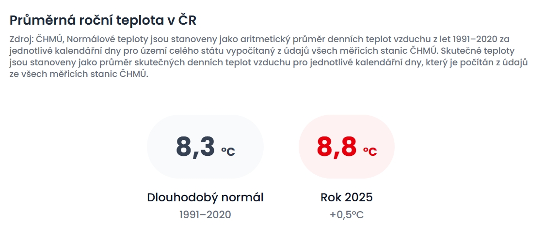 Jedním z důvodů meziročního nárůstu spotřeby je teplota. Loňský rok byl sice mírně teplejší (+0,5 °C) než teplotní normál, nicméně byl o 1,5 °C chladnější než rok 2024, který byl z hlediska průměrné teploty nejteplejším rokem od roku 1961.