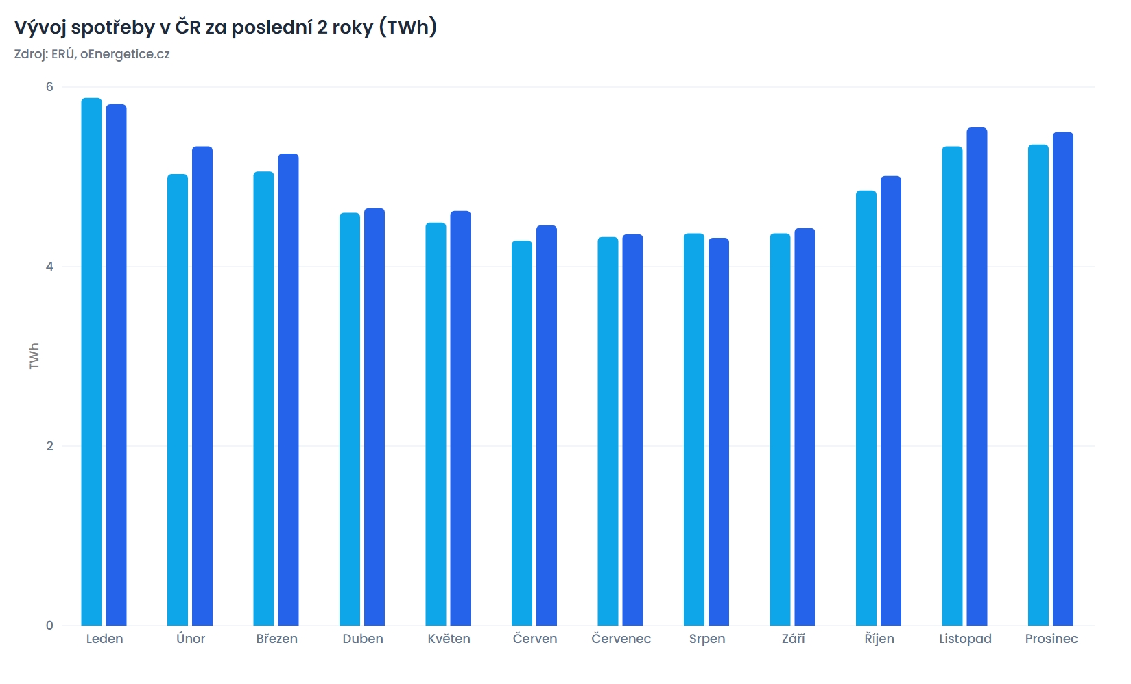 Meziroční nárůst spotřeby elektřiny nastal vyjma ledna a srpna ve všech měsících roku. Nejvyšší meziroční nárůst zaznamenal únor, kdy čistá spotřeba elektřiny vzrostla o zhruba 6 %. Důvodem je zejména teplota, kdy loňský únor byl výrazně chladnější než mimořádně teplý únor v roce 2024.