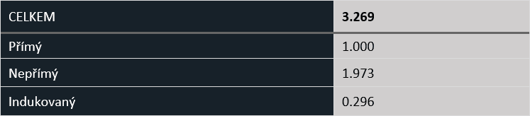 Celkový multiplikátor v tomto případě dosahuje hodnoty 3,27. To znamená, že každá investovaná 1 Kč do výstavby nového jaderného zdroje znamená celkový přínos pro českou ekonomiku ve výši 3,27 Kč, a to kombinací přímého, nepřímého a indukovaného efektu.