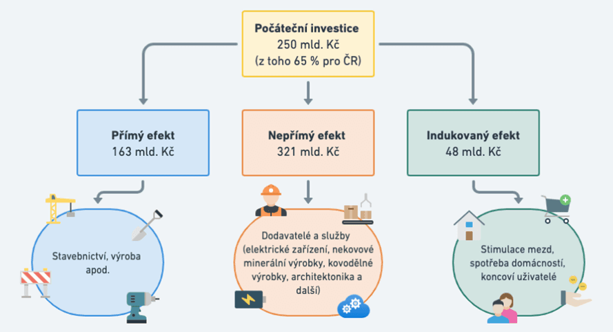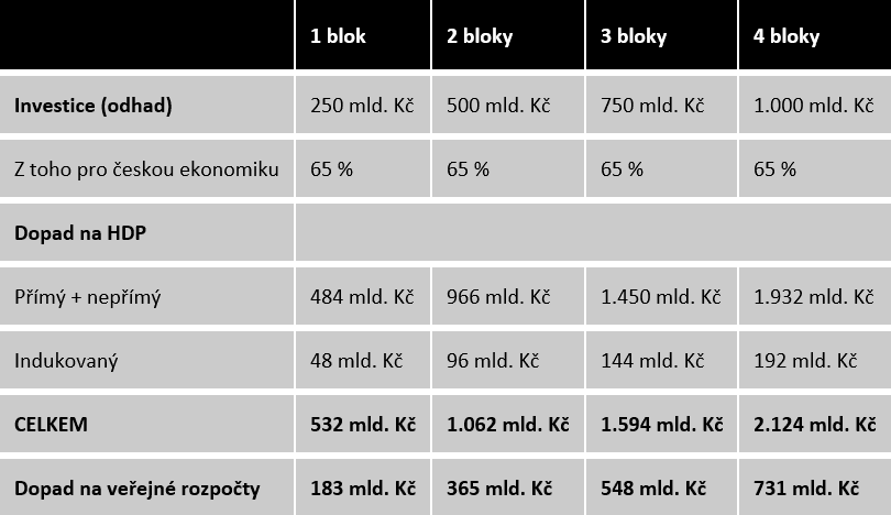 Schválené teze pro aktualizaci Státní energetické koncepce i návrh Klimaticko-energetického plánu hovoří o výstavbě minimálně třech velkých jaderných bloků. Pokud tedy hodnota investice dosáhne částky 750 mld. Kč (východiskem je veřejný odhad investice do jednoho bloku 250 mld. Kč) a pro české dodavatele bude alokováno 65 % této částky, odhad celkového dopadu na český HDP činí 1 594 mld. Kč a v případě dodatečných daňových příjmů do státního rozpočtu se jedná o částku 548 mld. Kč.