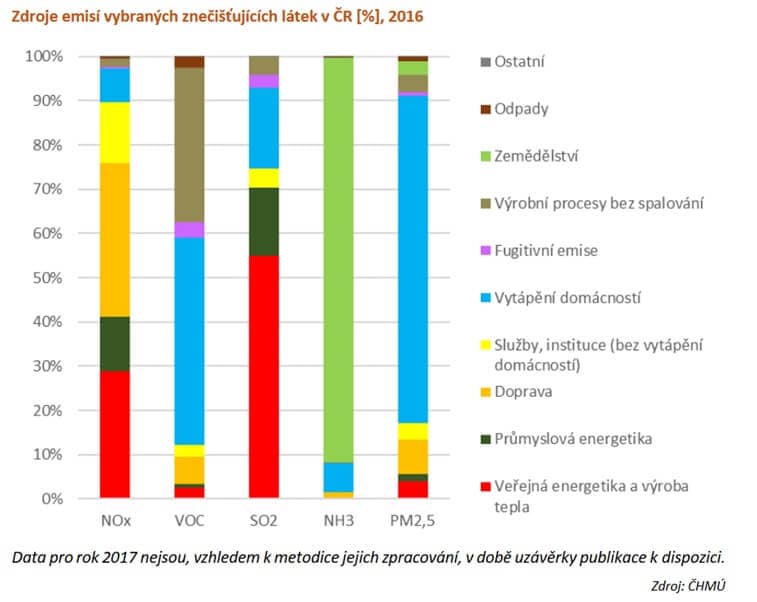 Za špatnou kvalitu ovzduší mohou, krom přirozených jevů, především průmyslové podniky, doprava či tradiční výroba elektřiny a tepla. Ač například emise oxidů dusíku (NOx), těkavých organických látek (VOC), CO a jiných částic z dopravy od roku 2000 poklesly, celkově se kvalita ovzduší nezlepšuje. Na nejzatíženějších lokalitách byly v minulém roce pravidelně překračovány imisní limity a vliv lokálního znečištění na lidské zdraví je nadále prohlubován. Na stav ovzduší v Česku má vliv i přeshraniční přenos znečištění, především z Polska. Nejhůře zasaženými oblastmi je tradičně Ostravsko, Zlínský kraj a Polabská nížina.