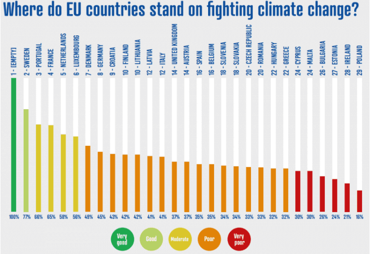 Zpráva CAN hodnotí členské země do tří hlavních skupin, na „dobré“, „špatné“ a „ošklivé“. Mezi „dobré“ patří Švédsko, Portugalsko, Francie, Nizozemsko a Lucembursko. Tyto země mají nejvyšší skóre, protože mají ambiciózní klimatické politiky a zároveň jsou aktivní v debatě o budoucích cílech EU. „Špatnými“ členskými státy jsou Belgie, Dánsko, Německo a Velká Británie. O těchto zemích CAN hovoří jako o bývalých lídrech aktivit v klimatické oblasti, kteří nyní „cílí nízko i přes jejich relativní bohatství“.