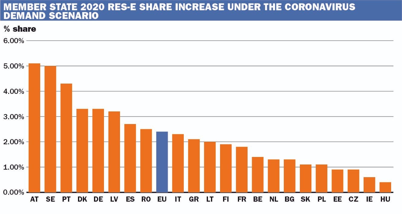 Analýza ICIS vyčísluje potenciální dopad vlivu omezení v souvislosti s infekčním onemocněním Covid-19 na 10% pokles spotřeby energie v Evropě mezi březnem a červnem. Výsledky tohoto scénáře pro EU jako celek ukazují nárůst podílu obnovitelných zdrojů na hrubé konečné spotřebě elektřiny (tzv. RES-E) ve výši 2,4 %, jelikož pokles spotřeby elektřiny je mnohem větší než pokles výroby obnovitelných zdrojů.