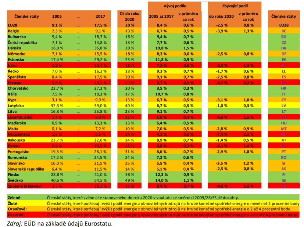 Česká republika se řadí k zemím, které mají svůj cíl pro rok 2020 již splněn. Navyšování podílu OZE probíhalo v ČR podobným tempem jako například v Německu, ambicióznější Německé cíle však pro našeho západního souseda nyní představují hrozbu, že svého závazku nedosáhne.