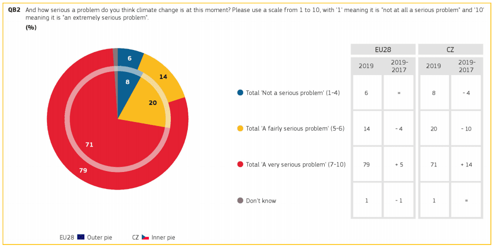 Evropská komise zveřejnila data veřejného průzkumu týkajícího se postoje občanů EU ke klimatické změně a k boji proti změně klimatu. V ČR se průzkumu zúčastnilo 1 019 lidí. Z těchto lidí si 71 % myslí, že klimatická změna je velmi vážným problémem.