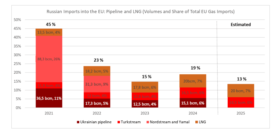V letech 2021 až 2023 snížila EU dovoz ruského plynu o více než 70 %, ze 150 miliard m3 na 43 bcm. V roce 2024 se tento sestupný trend zastavil a dovoz z Ruska vzrostl. Dovoz LNG vzrostl o 12 % ve srovnání s rokem 2023, z 18 miliard m3 na 20 miliard m3 a potrubí o 26 % z 25 miliard m3 na 32 bcm.