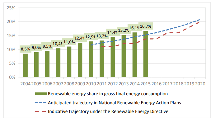 Podle zprávy o stavu energetické unie se Evropa posouvá od energetického systému založeného na fosilních palivech na nízkouhlíkový, plně digitální energetický systém orientovaný na spotřebitele. Roste podíl OZE v energetických mixech EU a Unie je tak na dobré cestě ke splnění 20% podílu na konečné spotřebě do roku 2020. Emise skleníkových plynů mezi lety 1990-2016 klesly o 23 %, přičemž HDP celé EU vzrostlo o 53 %. V sektoru dopravy nicméně emise stále rostou. Spotřeba energie, podobně jako emise, klesá nezávisle na růstu HDP. To je podle Komise primárně důsledkem přijatých opatření v oblasti energetické účinnosti.