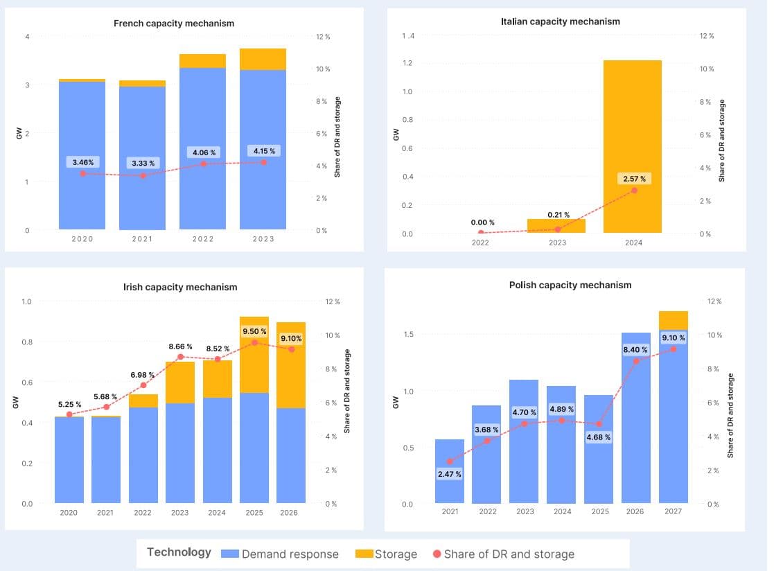 ACER dále poukázal na nízký podíl řiditelné spotřeby (demand response) a úložišť elektřiny (storage) na celkovém kontrahovaném výkonu ve sledovaném období. V budoucích letech by však podle ACERu měl podíl těchto zdrojů flexibility růst a v Polsku a Irsku by například v roce 2026 měl dosáhnout téměř 10 %.