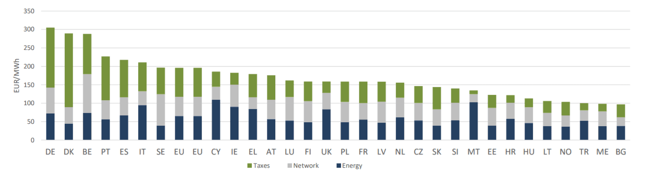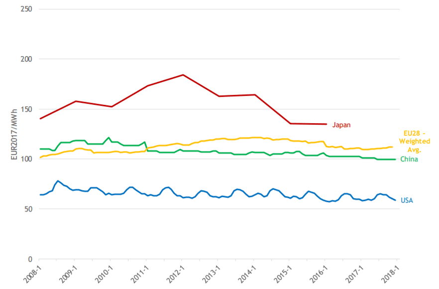 Nejvíce za elektřinu již tradičně platí německé domácnosti, kde průměr dosahuje 0,305 EUR/kWh (7,8 CZK/kWh), v těsném závěsu jsou domácnosti z Dánska a Belgie. Česká republika se s 0,144 EUR/kWh (3,7 CZK/kWh) drží výrazně pod průměrem EU28, který činí 0,204 EUR/kWh (5,2 CZK/kWh).