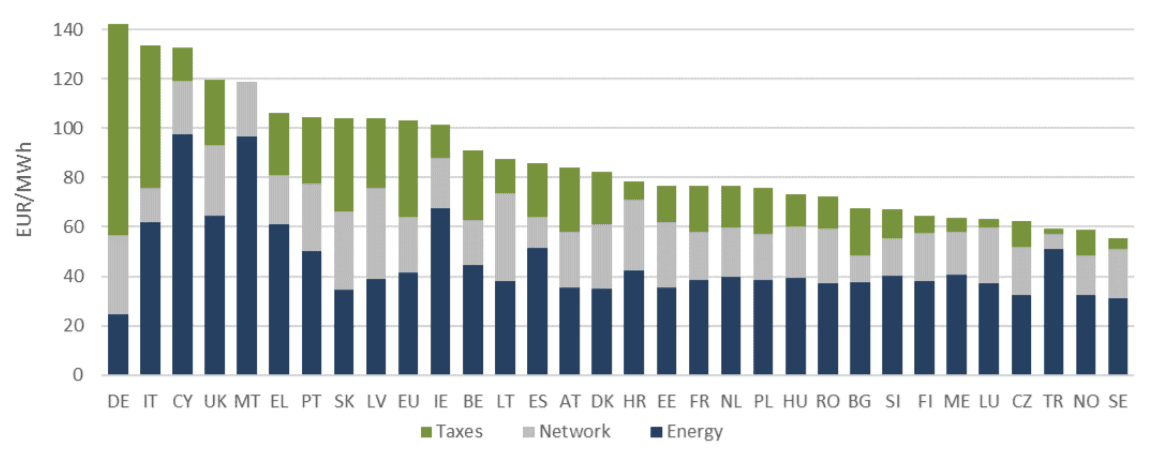 I v případě cen pro podniky si za elektřinu zaplatí nejvíce německé firmy. Zatímco cena za silovou elektřinu je v Německu nejnižší z celé EU, síťové poplatky a další poplatky a daně, které pro průměrný podnik tvoří více než 80 % konečné ceny za elektřinu, vyšvihnou Německo na nelichotivé první místo.
