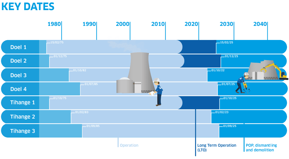 Podle plánu, který belgická koaliční vláda oznámila v prosinci 2021, byla elektrárna Doel 3 odstavena v září loňského roku a elektrárna Tihange 2 nyní v roce 2023. Novější bloky Doel 4 a Tihange 3 by měly být odstaveny do roku 2025 spolu s bloky Doel 1 a 2, kterým byla v roce 2014 prodloužena provozní licence.