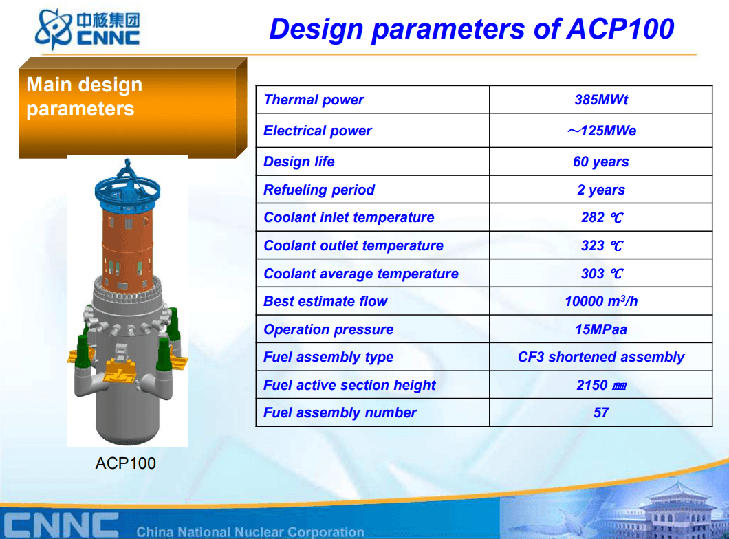 Integrovaný reaktor PWR ACP-100 je ve vývoji od roku 2010. Předběžný projekt byl dokončen v roce 2014. Hlavní komponenty primárního chladicího okruhu jsou instalovány v tlakové nádobě reaktoru. V roce 2016 se tento projekt stal prvním reaktorem SMR, který prošel bezpečnostním hodnocením Mezinárodní agentury pro atomovou energii.