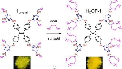 Výzkum publikovaný 31. května v časopise Journal of the American Chemical Society popisuje, jak výzkumníci použili sluneční záření k propojení malých molekul uvnitř velkých krystalů pro vytvoření nového materiálu. Tento přístup je odlišný od tradičních metod slučování molekul do jednoho bodu.