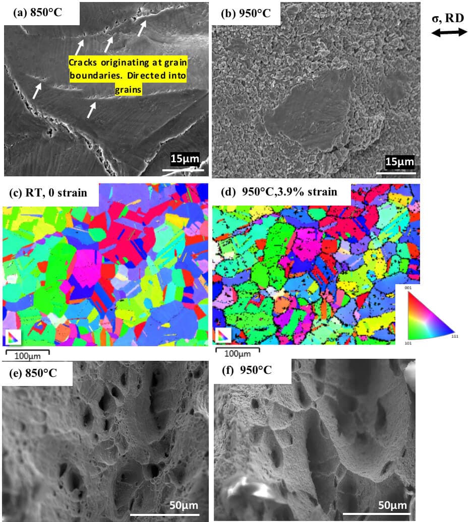 Snímky materiálu pod mikroskopem při vysokých teplotách pořízené v reálném čase. a)+b) růst trhlin vzorku při rostoucí teplotě, c) Slitina 709 před zkouškou, při pokojové teplotě d) při prodloužení materiálu o 3,9 % a teplotě 950 °C. e)+f) trhliny po zkoušce v tahu na vzorku při teplotě 850 °C a 950 °C; Zdroj: NCSU
