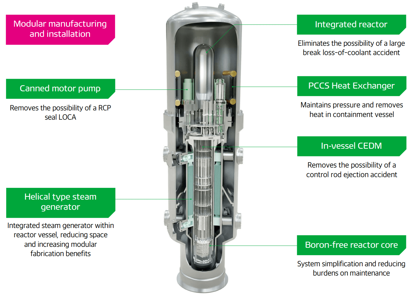 Reaktor i-SMR je integrovaný tlakovodní reaktor s elektrickým výkonem 170 MW. Vývoj probíhá podle stanoveného harmonogramu s cílem dokončit návrh do konce roku 2025 a získat schválení standardního designu v roce 2028. Podle údajů KHNP vyžaduje tato technologie pouze třetinové investiční náklady oproti velkým reaktorům a její výstavba může být dokončena za polovinu času.
