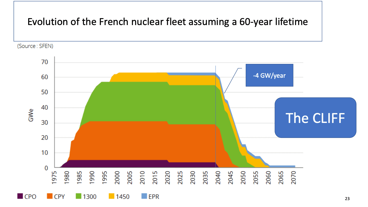 Ve Francii bylo nejvíce reaktorů uvedeno do provozu v průběhu osmdesátých let. Důsledkem je, že mezi rokem 2040 a 2050 se instalovaný výkon jaderných elektráren sníží z cca 60 GW až na 15 GW.