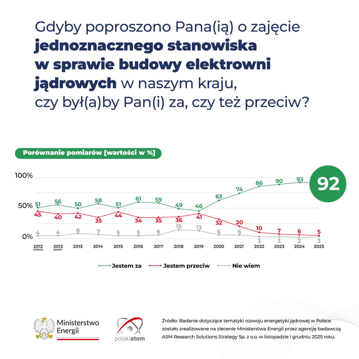 Průzkum veřejného mínění z konce roku 2025, zadaný polským ministerstvem energetiky, ukazuje výraznou podporu jaderné energetiky v zemi: