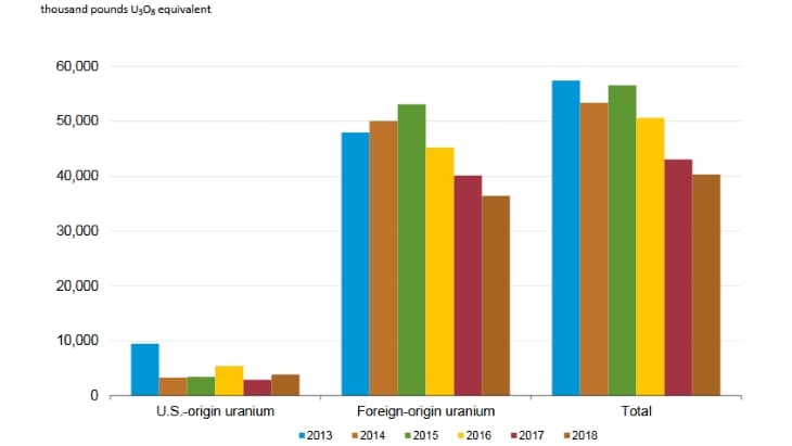 Uranové palivové soubory zavezené do amerických jaderných reaktorů v roce 2018 obsahovaly 50,2 miliónů liber U3O8e, ze kterých bylo11 % původem z USA.