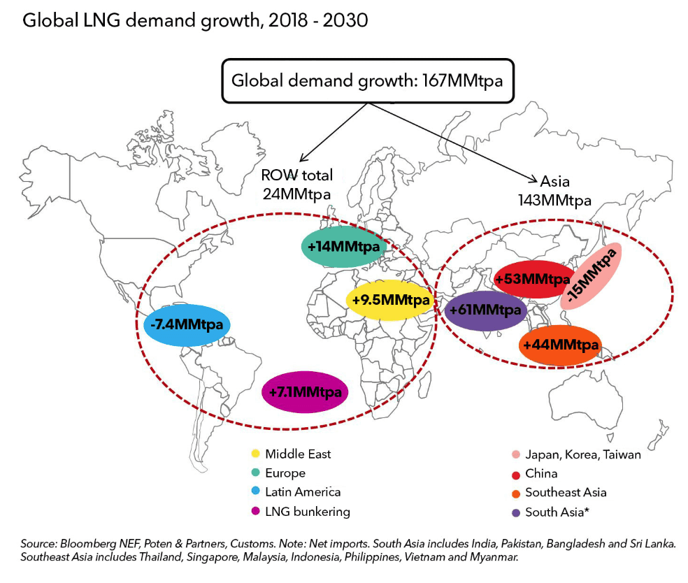 „Tento region zvýší v období 2017-2030 poptávku o celkem 143 mil. tun/rok, což představuje 86 % světového nárůstu poptávky po LNG v tomto období.“ dodal BNEF