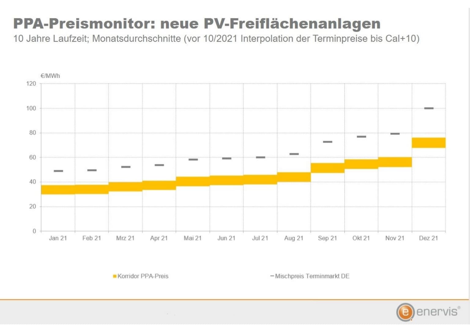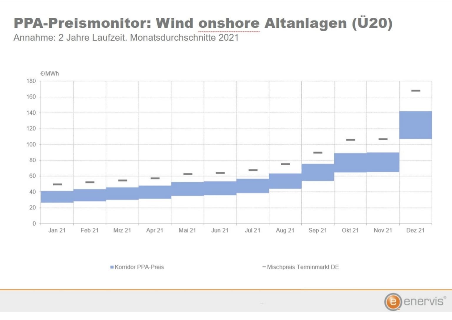 Cenová hladina PPA v Německu se v průběhu roku 2021 neustále zvyšovala, přičemž v prosinci došlo k obzvláště prudkému nárůstu. Větrné elektrárny na pevnině starší než 20 let, kterým tudíž vypršela provozní podpora, dosahovaly v prosinci 2021 v rámci dvouleté smlouvy o dodávkách na roky 2022 a 2023 fixní ceny mezi přibližně 107 a 142 eury za MWh. Oproti cenám z listopadu se jedná o nárůst o 42 až 52 EUR/MWh, tedy o 58 % až 64 % během jednoho měsíce.
