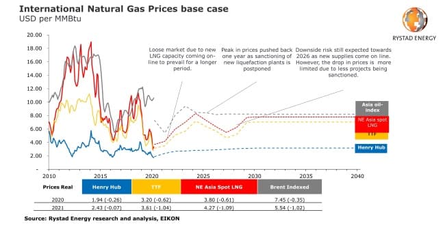 Ceny plynu již byly v důsledku mírné zimy v Evropě i Asii, rychlého rozvoje LNG kapacit v minulých letech a související celosvětové hojnosti dodávek zkapalněného zemního plynu nízko a dle odhadu Rystadu bude trvat roky, než se vzpamatují z dopadu COVID-19.
