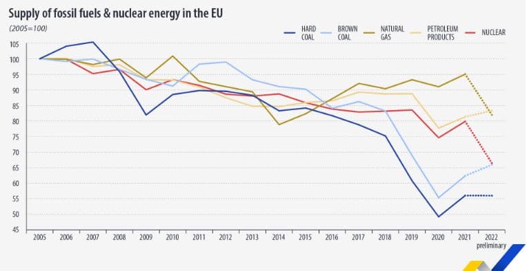 Předběžná energetická data za rok 2022 ukazují, že po roce 2021, kdy byl pozorován růst dodávky u všech sledovaných paliv (černé a hnědé uhlí, zemní plyn, ropné produkty a jaderné palivo), došlo loni k prudkému poklesu u jaderného paliva a zemního plynu, zatímco dodávka hnědého uhlí a ropných produktů nadále rostla. Hrubá výroba elektřiny poklesla meziročně o 3 %. Vyplývá to z údajů zveřejněných Eurostatem.