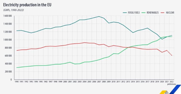 Vývoj výroby elektřiny v EU od roku 1990. Zdroj: Eurostat