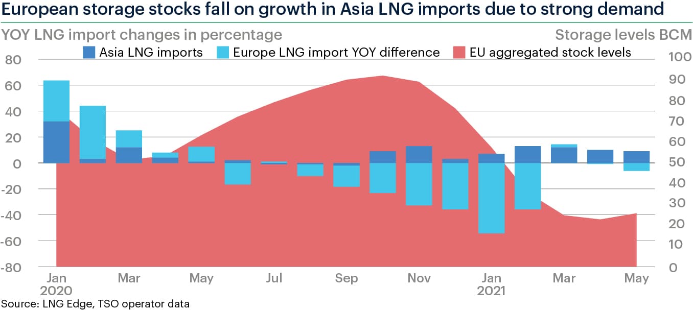 Kromě poptávky způsobené nedostatkem plynu v Evropě bude světový benchmark TTF ovlivněn zvýšenou konkurencí z Asie. Silné oživení spotových cen a prudce rostoucí poptávka v Asii přitáhly flexibilní nabídku zkapalněného zemního plynu (LNG) do tichomořské pánve, což zabránilo vyššímu doplňování evropských skladovacích zásob.