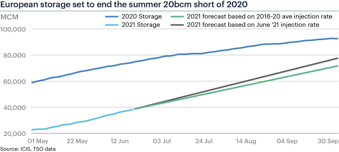 Pomalé naplňování plynových zásobníků vede k tomu, že zvýšená poptávka po vtláčení téměř jistě zůstane po celý zbytek léta, což posílí ceny kontraktů plynu a elektřiny ve 3. čtvrtletí. To bude podle analytiků z ICIS pravděpodobně znamenat, že kontrakty pro následující měsíc v nadcházejících dnech a týdnech otestují historická maxima.