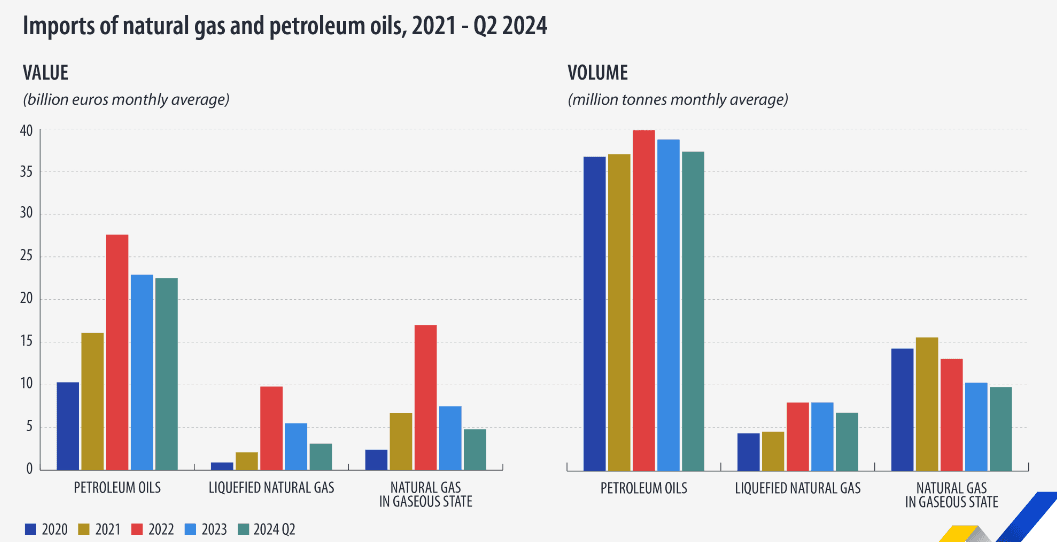 Dovoz energetických komodit do EU nadále klesá. Ve druhém čtvrtletí letošního roku dovezly členské státy ropné produkty a zemní plyn v hodnotě 95 miliard eur a objemu 177,9 milionů tun. Proti stejnému období loňského roku se jedná o pokles o 10,7 % v případě hodnoty a o 9,7 % u objemu. Informoval o tom evropský statistický úřad Eurostat.