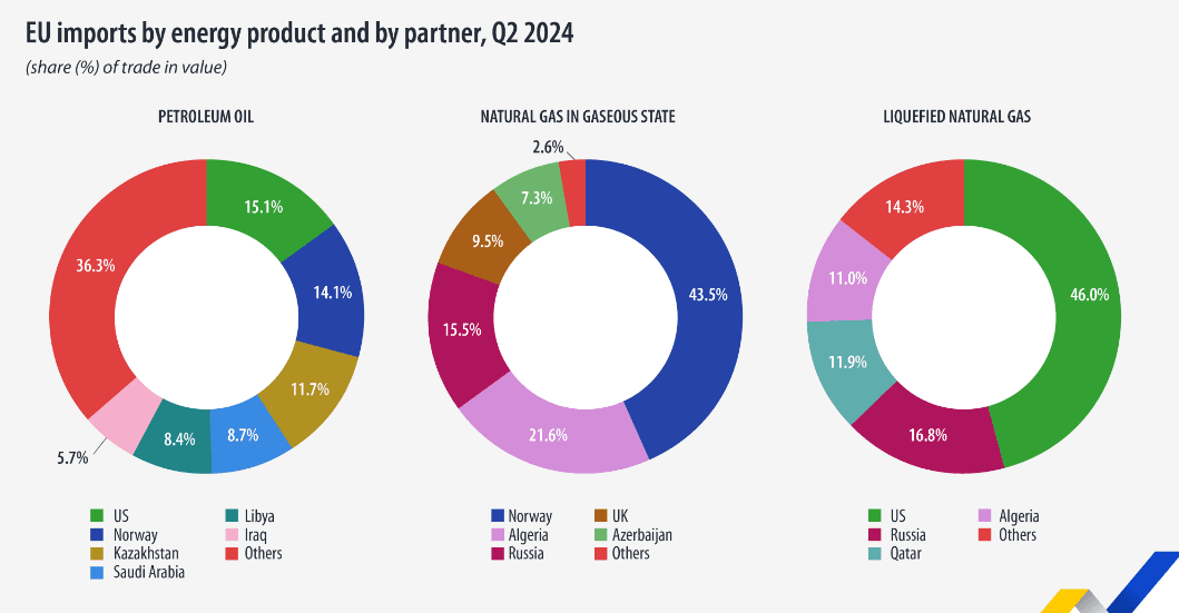 Hlavními dovozci ropných produktů do zemí EU byly stejně jako v prvním čtvrtletí roku 2024 Spojené státy americké (15,1 %), Norsko (14,1 %) a Kazachstán (11,7 %).