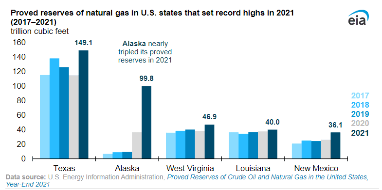 Prokázané zásoby zemního plynu na Aljašce byly v roce 2020 přibližně 1 bilion metrů krychlových. V předloňském roce se zvýšily na 2,8 bilionů metrů krychlových. K podobně dramatickému nárůstu přitom v tomto státě došlo už o rok dříve. Mezi lety 2019 a 2020 se prokázané zásoby plynu téměř zčtyřnásobily. Důvodem je primárně rozvoj LNG projektu na Aljašce a další návazné plynovodní infrastruktury, která má LNG terminál na severu Aljašky propojit s jihem.