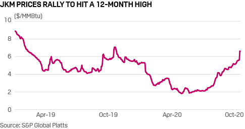 Spotové ceny zkapalněného zemního plynu (LNG) na referenčním trhu v severní Asii – JKM (Japan Korea Marker), dosahují takřka svého ročního maxima uprostřed zvýšené poptávky vyvolané předpovědí chladné zimy a četnými výpadky v dodávkách.