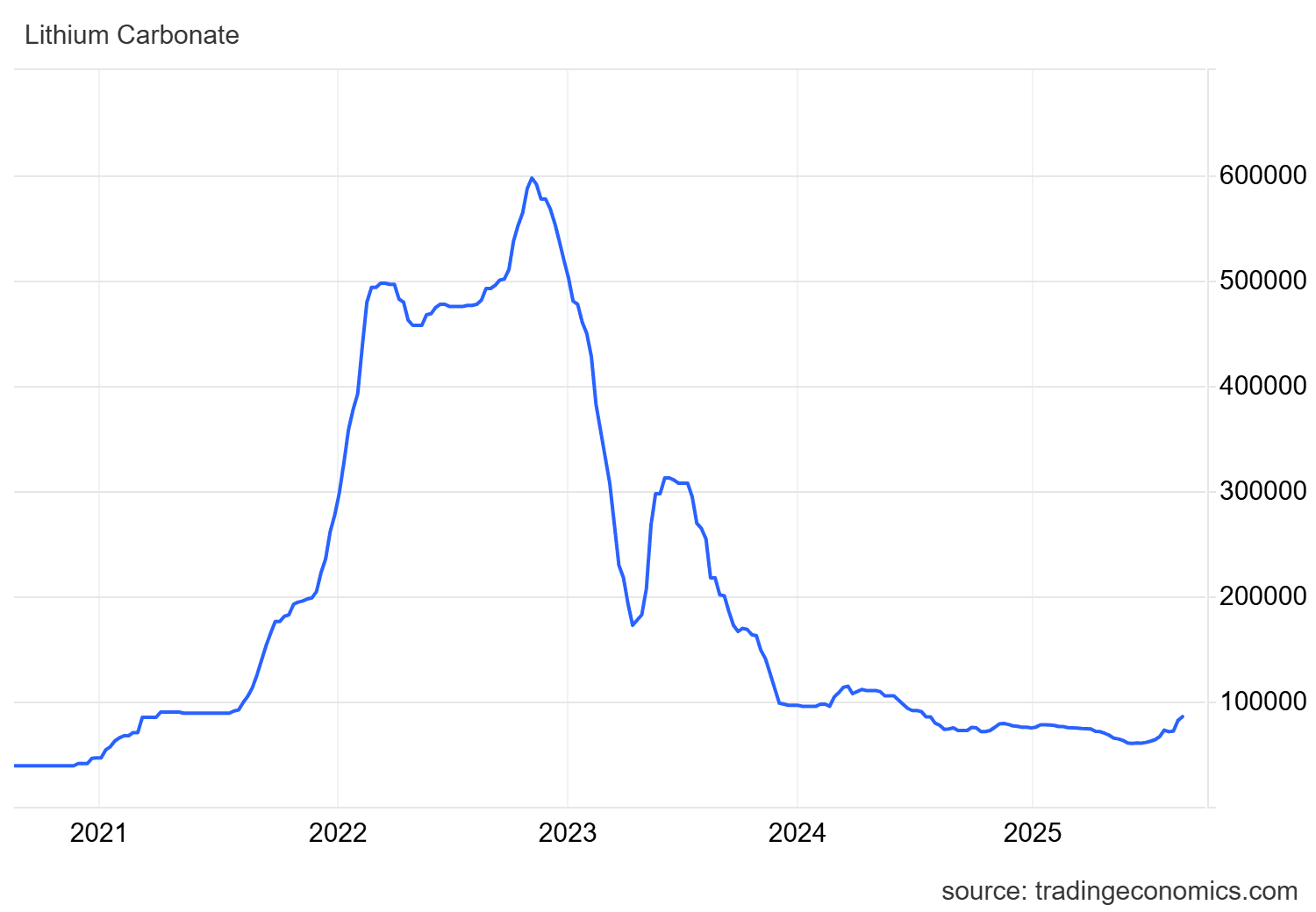 Trh s lithiem prochází v posledních letech dramatickými výkyvy. Po rekordním růstu cen v roce 2022, kdy se cena uhličitanu lithného vyšplhala nad 80 000 USD za tunu, následoval pád na úrovně kolem 10 000 USD/t v roce 2025. Hlavním důvodem není oslabení poptávky, ale prudký nárůst nabídky, zejména z Číny, který převážil nad tempem růstu elektromobility a akumulačních technologií. Výsledkem je přebytek na trhu, jenž může trvat až do roku 2027 a ohrožuje ekonomiku řady projektů.