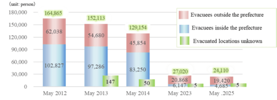 Stále tak zůstává okolo 24 000 evakuovaných, kteří se ještě do svých domovů vrátit nemohli. Ještě v šesti samosprávných oblastech je stále méně než polovina původního počtu obyvatel. Lidé se však vracejí i do měst Ókuma a Futaba, kde se elektrárna nachází. V Ókumě už počet navrátilců překročil 10 % původního počtu obyvatel.