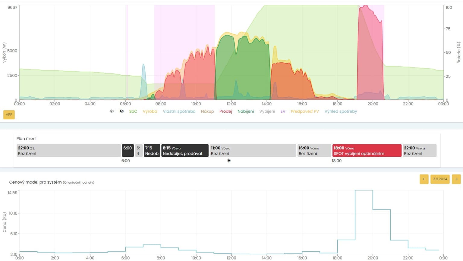 Dalším vylepšením je pak kombinace větší baterie s chytrým řízením. Střídač FVE je řízen softwarem AiFlexibility a jeho detailní popis lze najít zde: https://www.prosolar.cz/novinky-blog/ai-flexibilita-dil-c2-trvala-sluzba-klientum. Na trhu se již objevilo několik distributorů elektřiny, kteří nabízejí své SW řízení pro všechny hlavní výrobce střídačů (Deltagreen, Electree). Neřízená FVE začne nabíjet stacionární baterii hned po úsvitu, kdy jsou ještě ceny na SPOTu vysoko, pak se během dopoledne nabije a během poledne s často zápornou cenou tlačí elektřinu do sítě. Naopak řízení dopoledne nechá za vyšších cen cíleně přetékat do sítě, pak se během poledne za nízkých výkupních cen dobije stacionární baterie a pokud večerní výkupní ceny přesáhnout uživatelem nastavenou cenu, může část kapacity prodat za vysoké výkupní ceny do sítě. Rekordní byl v tomto roce 3.9., kdy dosáhly spotové ceny okolo 8. večer skoro 15Kč/kWh. Zde je nutné zdůraznit, že takové podmínky nenastávají příliš často, nicméně prodeje elektřiny do večerní špičky výrazně zlepšují návratnost instalace.