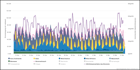 Německo investovalo obrovské úsilí a finance do instalace větrných a fotovoltaických zdrojů. V současné době tak má instalovaný výkon ve fotovoltaice okolo 60 GWp, a u stejné hodnoty je celkový instalovaný výkon ve větrných turbínách. Požadovaný výkon se v průběhu roku v Německu pohybuje mezi 50 až 80 GW. Je tak vidět, že samotná fotovoltaika dokáže v době ideální polední špičky už nyní pokrýt celý požadovaný výkon, a stejně je tomu i u větrných turbín. V době, kdy hodně fouká a svití, má už nyní Německo i velký přebytek elektřiny z větru a slunce. Část těchto zdrojů tak v té době musí vypínat. Tento problém je zvýrazněn i tím, že ani v takové situaci nelze zastavit fosilní zdroje úplně, protože se musí udržovat v horké rezervě při určitém výkonu, aby mohly zajistit při změně počasí a podmínek náhradu větrných turbín a fotovoltaiky.