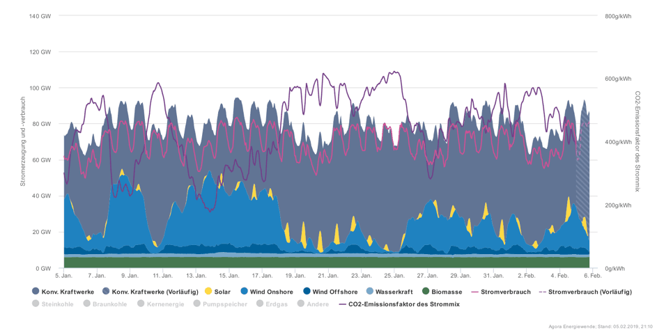 Na údajích z Agorametru za poslední měsíc je vidět, že období, kdy fouká málo nebo téměř vůbec, nejsou vůbec výjimkou. A slunce v lednu moc opravdu moc nedodá (zelená – biomasa, velmi světle modrá – voda, tmavě modrá – mořské větrné, světlejší modrá – pevninské větrné, žlutá – fotovoltaika, tmavě šedá – klasické zdroje).