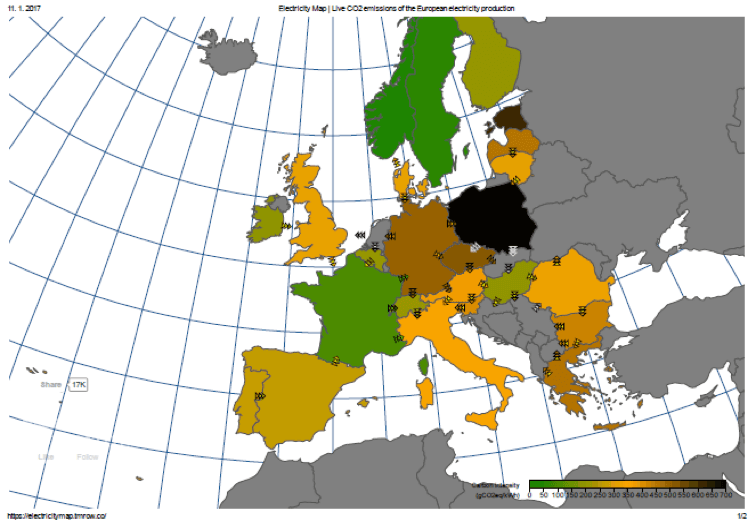Online zobrazení emisí ukazuje, že státy využívající kombinaci jádra a obnovitelných zdrojů mají nízké emise a jsou zbarveny do zelena (https://www.electricitymap.org/ ).