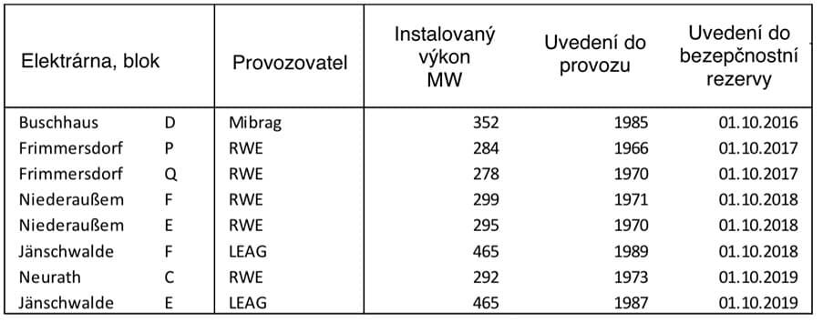 Německo aktuálně drží konvenční elektrárny v pohotovosti v následujících rezervách: